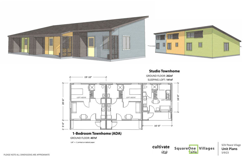 Peace Village features five unique floor plans to support a variety of small households, ranging from a 260 square foot studio with a 140 square foot sleeping a 788 square foot two-bedroom townhome. Alternating roof lines and color were used to visually break the buildings into individual homes. The compact homes are designed with deep energy efficiency in mind. Sutainability measures include highly insulated 2×8 wall construction, elevated airtightness measures, fully insulated slab construction, and high-efficiency heat pump space heating and water heating.